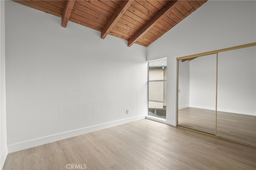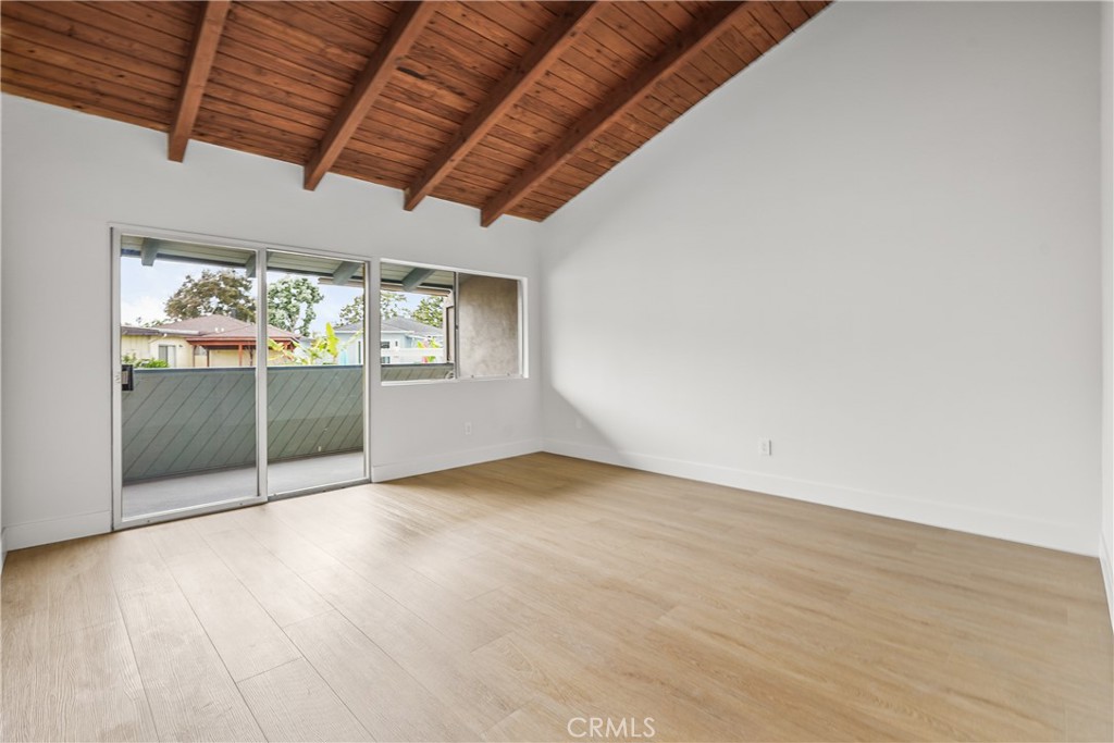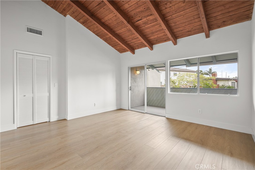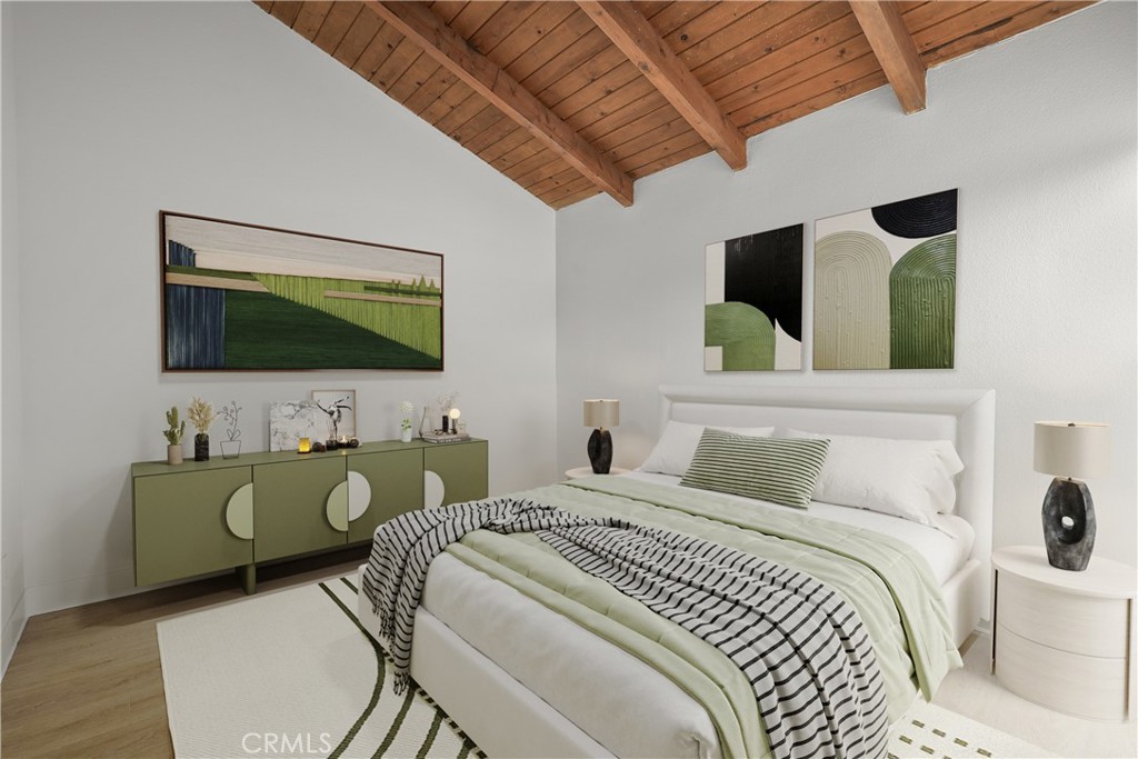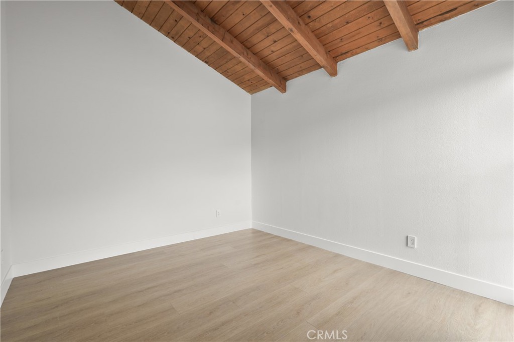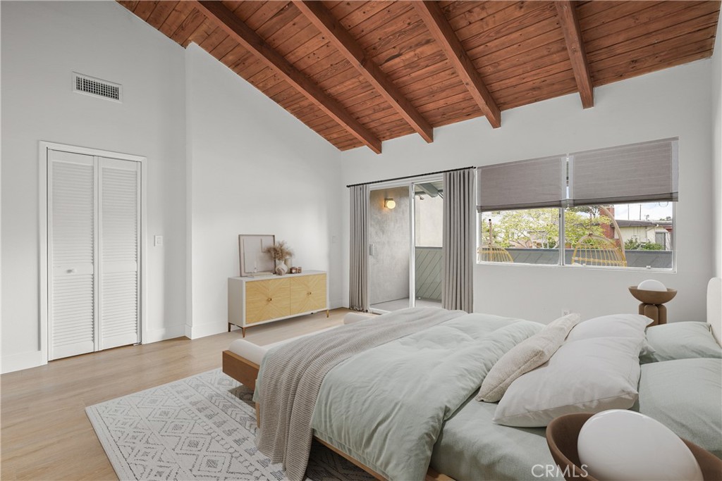 Upstairs, both bedrooms feature vaulted ceilings with exposed wood beams. The primary suite offers a walk-in closet, en-suite bath with dual sinks, and a west-facing balcony to enjoy coastal breezes.