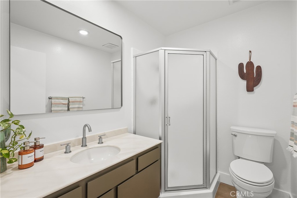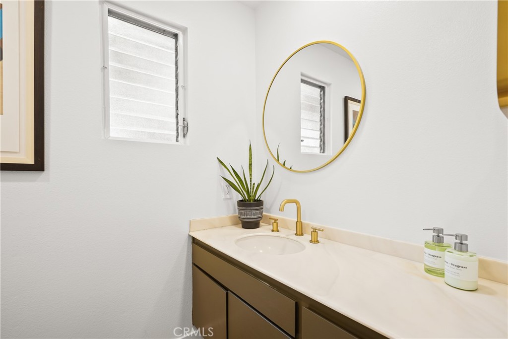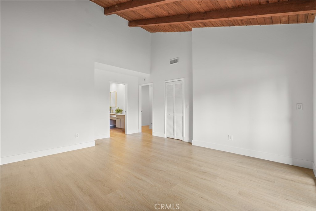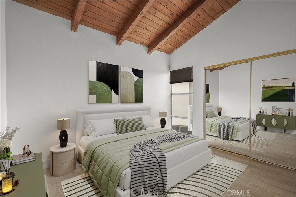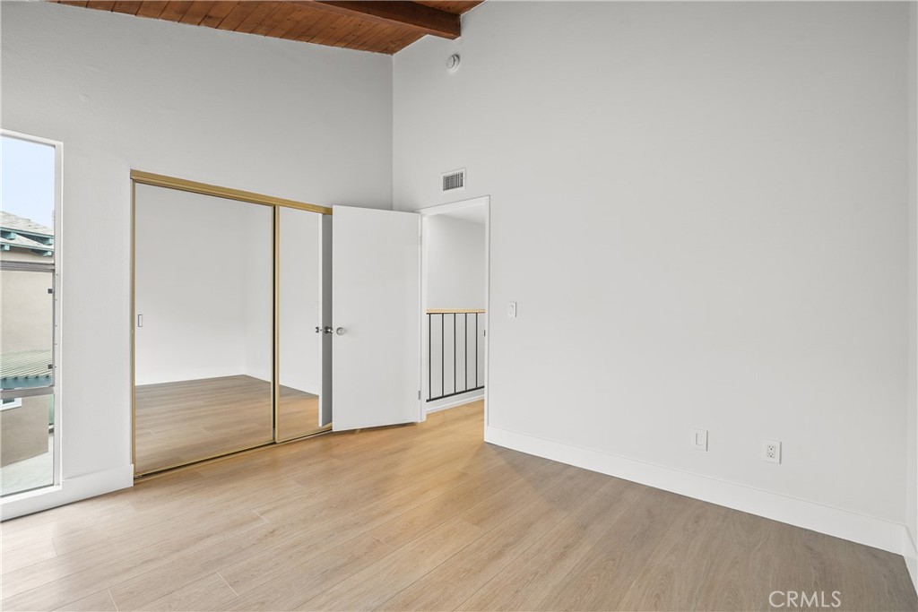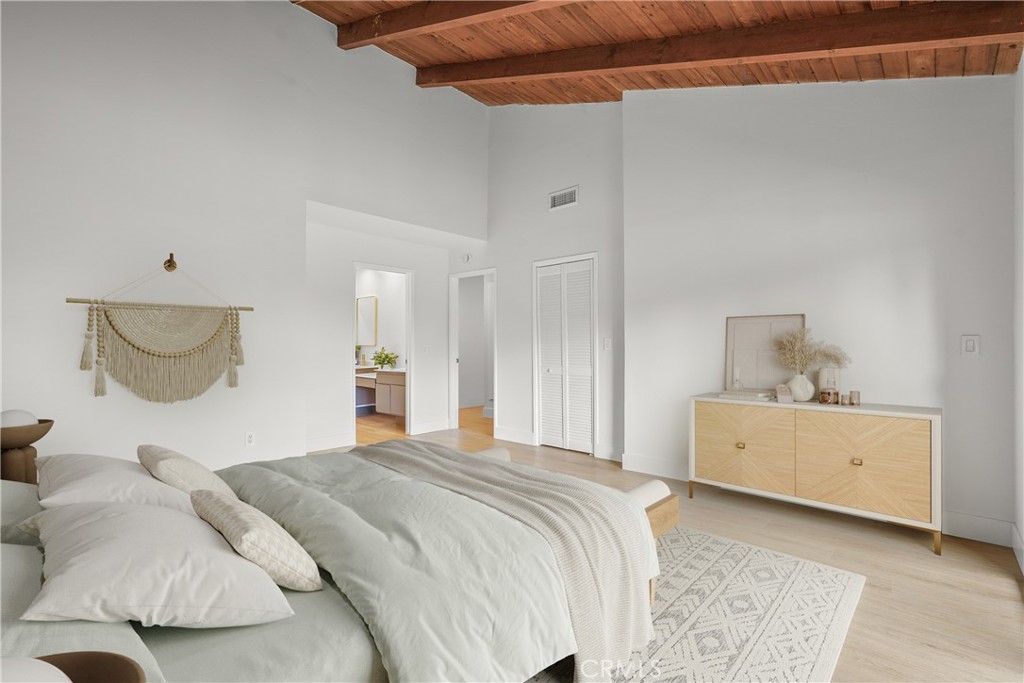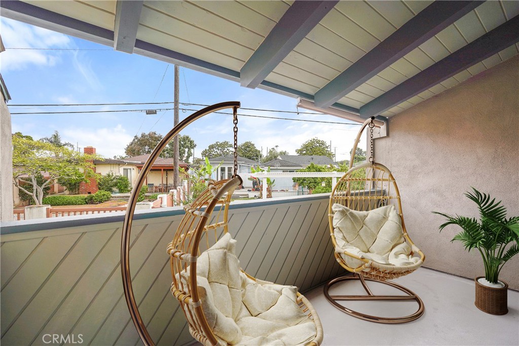 Upstairs, both bedrooms feature vaulted ceilings with exposed wood beams. The primary suite offers a walk-in closet, en-suite bath with dual sinks, and a west-facing balcony to enjoy coastal breezes.