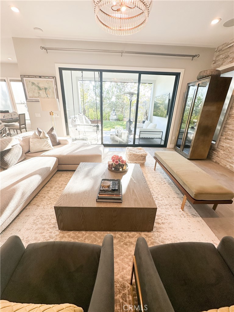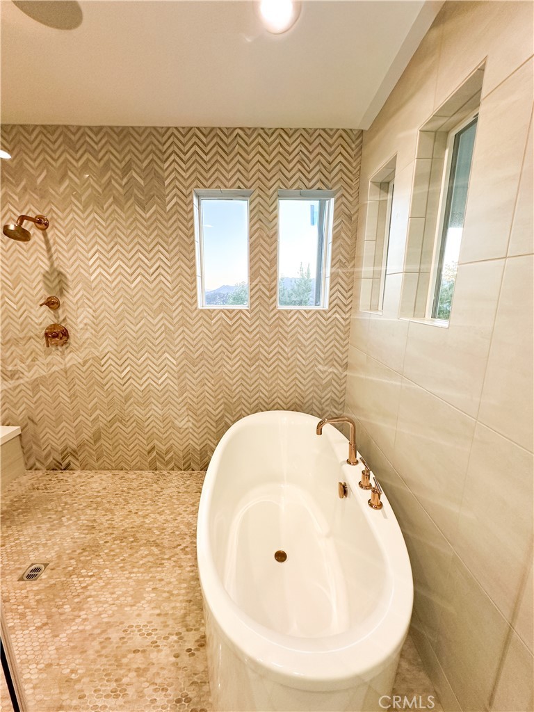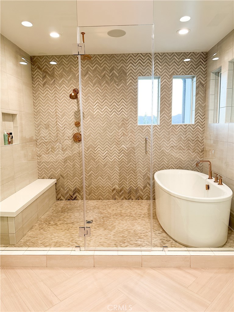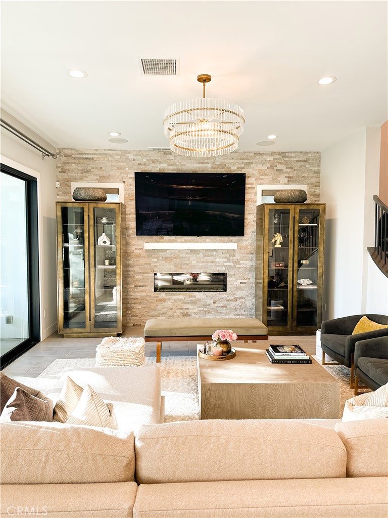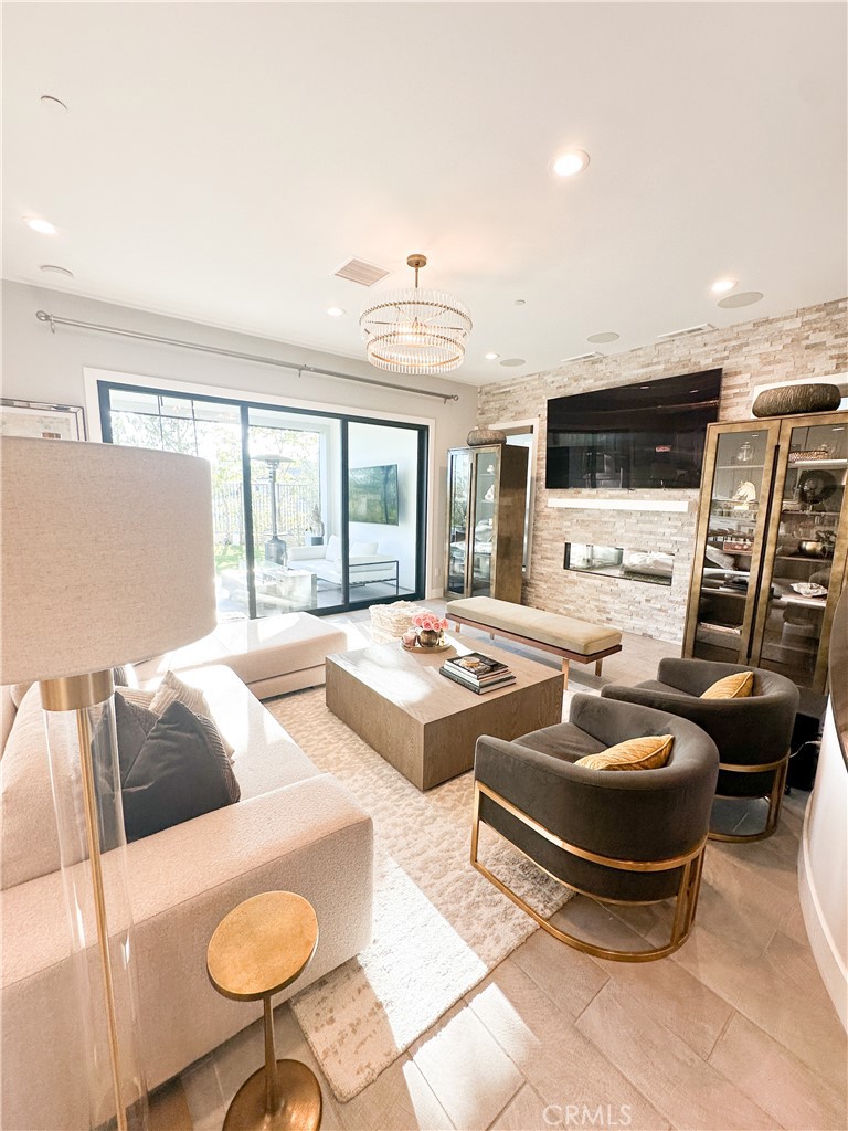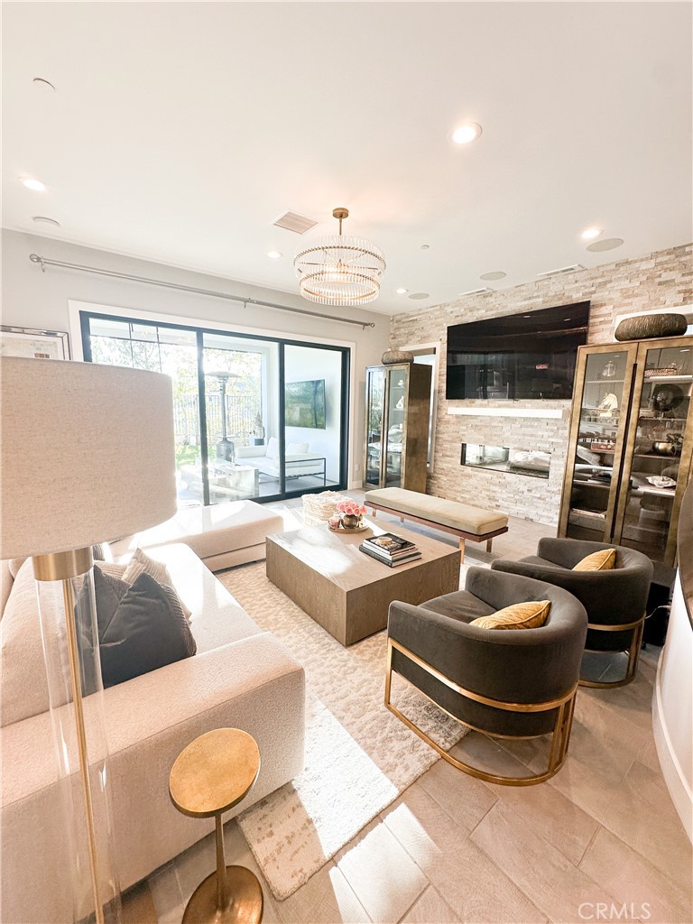 The Great Room features a designer linear fireplace embedded into a cream gold stack quartzite wall, an upgrade reserved only for the model homes. Expansive MULTI-PANEL STACKING DOORS in the great room provide the perfect escape to a cozy outdoor living space for seamless indoor-outdoor entertaining with a decked up in-built speaker and woofer system. The primary suite features a private DECK, spa-style main bathroom with his and hers, oversized custom rain head shower, and exotic bathtub, along with quartz blizzard waterfall countertops seamlessly blended into a background of antique bronze mirrors.