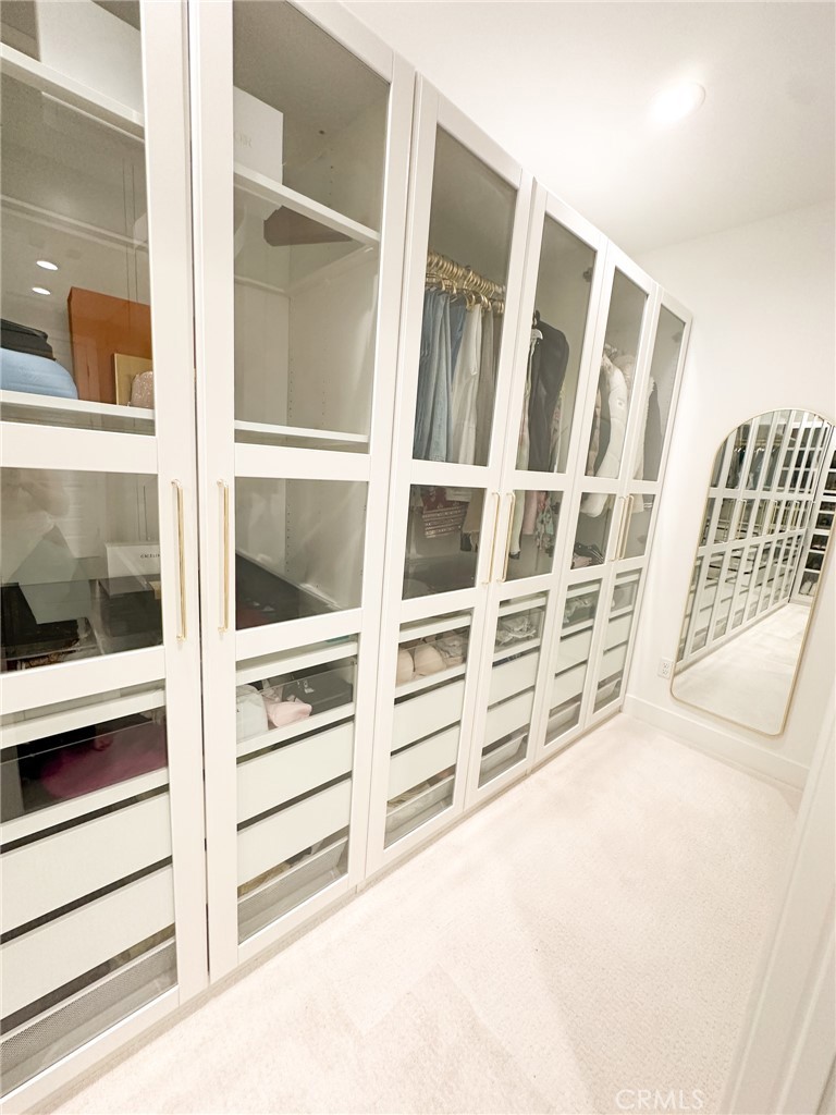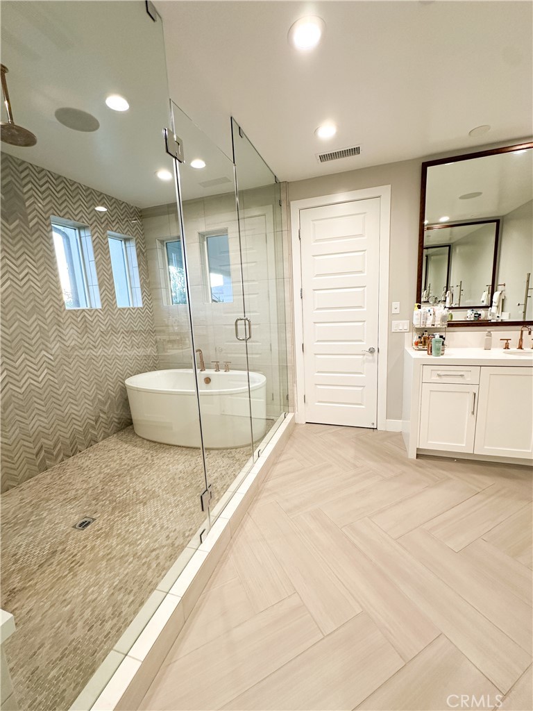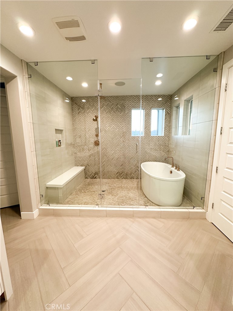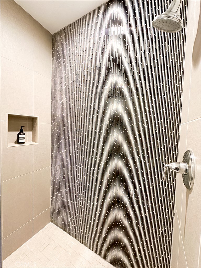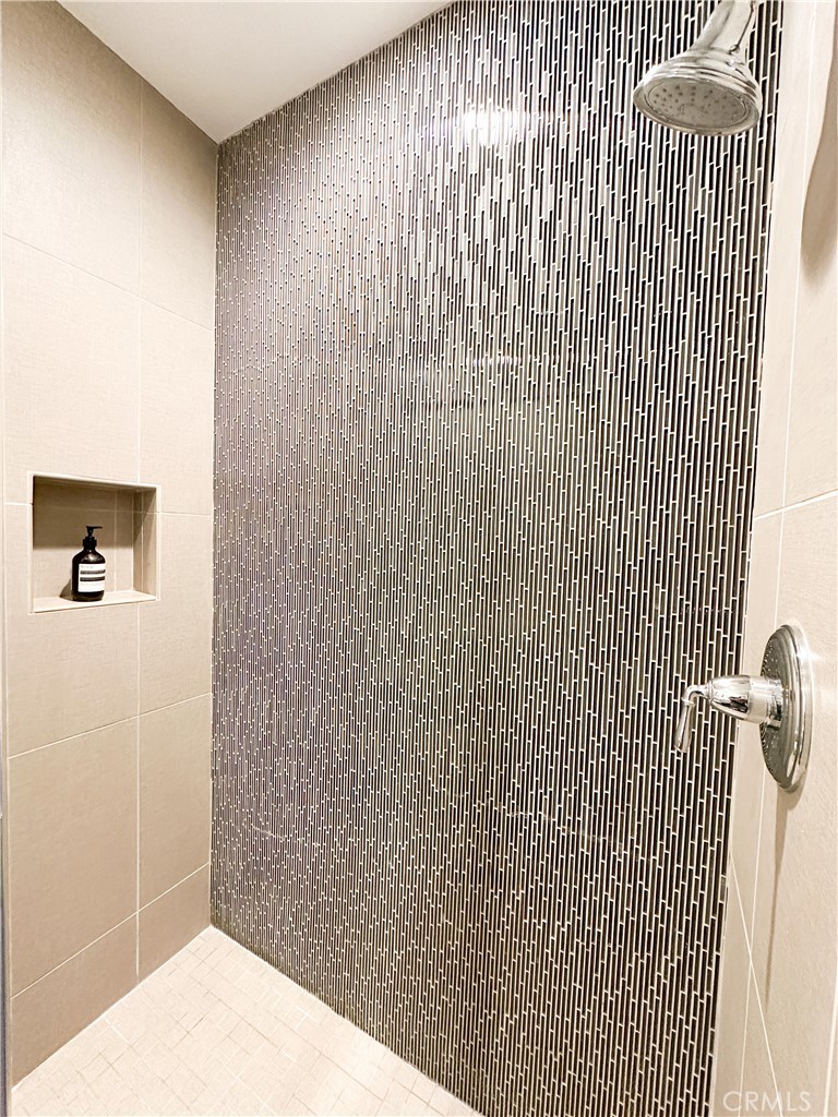 The Great Room features a designer linear fireplace embedded into a cream gold stack quartzite wall, an upgrade reserved only for the model homes. Expansive MULTI-PANEL STACKING DOORS in the great room provide the perfect escape to a cozy outdoor living space for seamless indoor-outdoor entertaining with a decked up in-built speaker and woofer system. The primary suite features a private DECK, spa-style main bathroom with his and hers, oversized custom rain head shower, and exotic bathtub, along with quartz blizzard waterfall countertops seamlessly blended into a background of antique bronze mirrors.