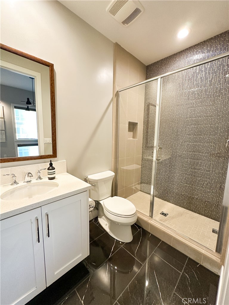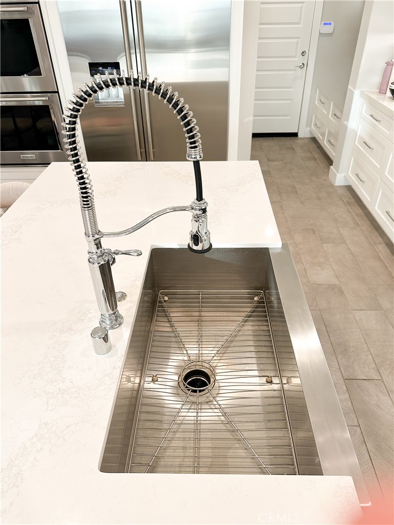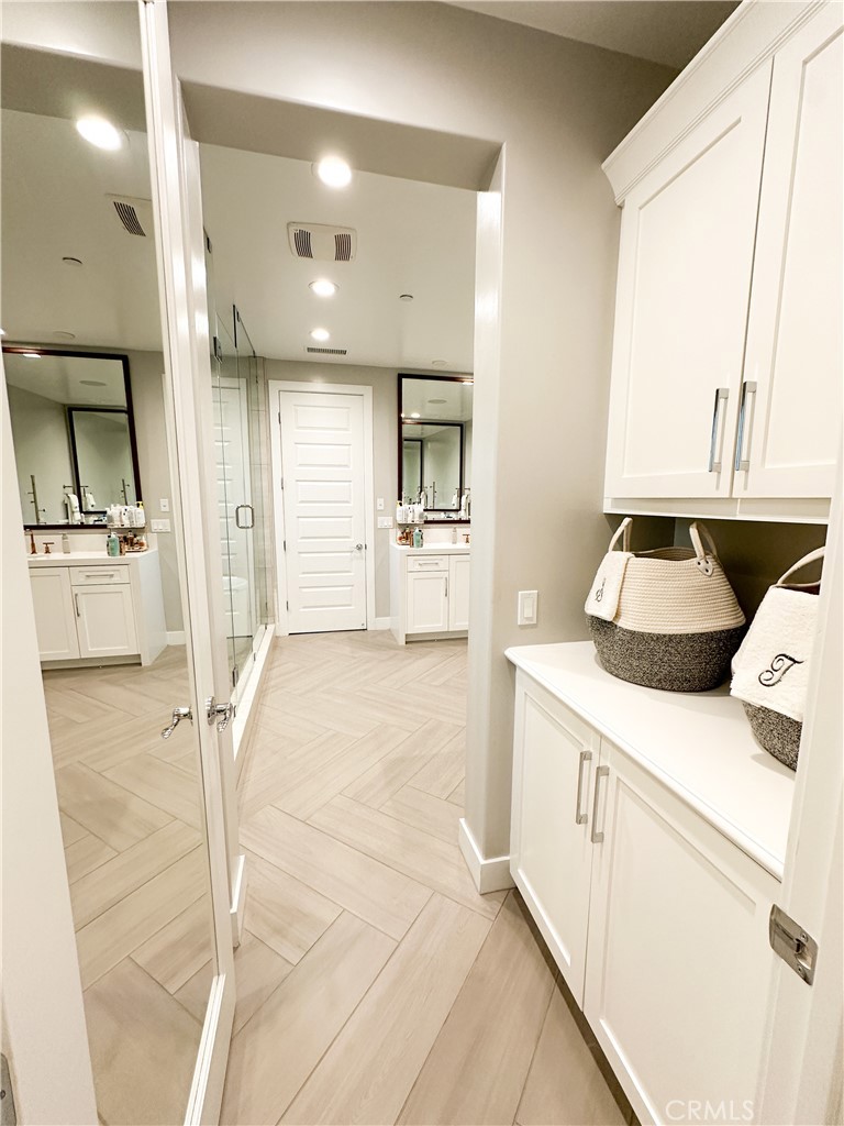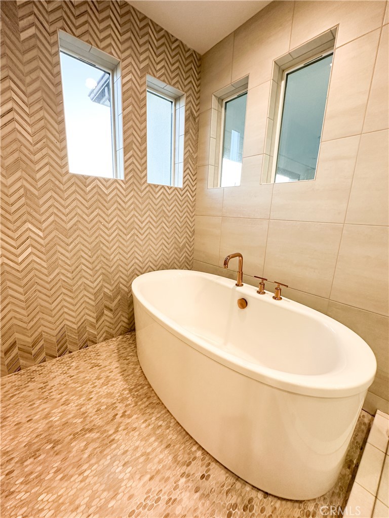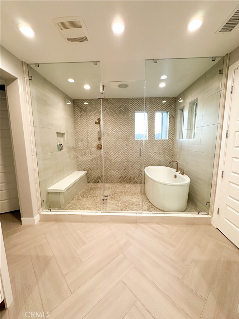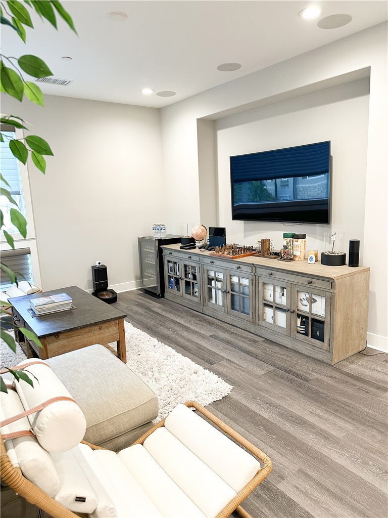 The Great Room features a designer linear fireplace embedded into a cream gold stack quartzite wall, an upgrade reserved only for the model homes. Expansive MULTI-PANEL STACKING DOORS in the great room provide the perfect escape to a cozy outdoor living space for seamless indoor-outdoor entertaining with a decked up in-built speaker and woofer system. The primary suite features a private DECK, spa-style main bathroom with his and hers, oversized custom rain head shower, and exotic bathtub, along with quartz blizzard waterfall countertops seamlessly blended into a background of antique bronze mirrors.