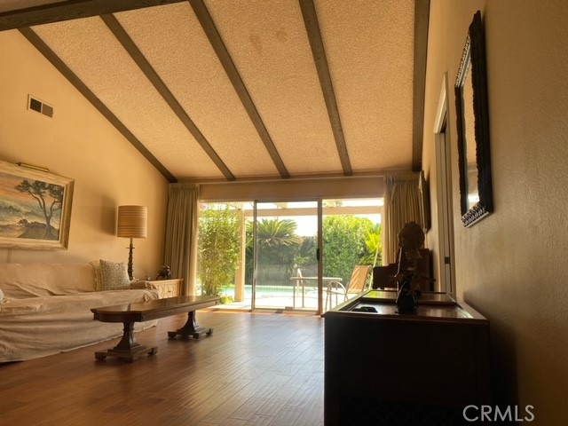 The formal entry leads into the living room which connects to the great room, A wall of glass + sliders opens to the outdoor pool area from the living room. High ceilings with wood beams accentuate the room, allowing natural light to flow throughout.